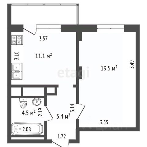 • Планировка: Прихожая (9,4 кв.м), изолированная кухня (11,1 кв.м), большая жилая комната (19,5 кв.м), утеплённая лоджия (4,6 кв.м), просторный совмещённый санузел (4,5 кв.м).