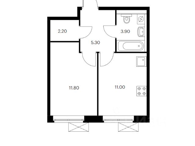 Комната: 24 м² — удобно зонируется на спальню и гостиную/кабинет; 2 двери в комнату, из кухни и коридора