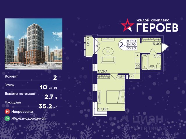 Продаётся 2-комнатная квартира в формате евро 35.20 кв. м. в жилом комплексе "Героев" в Балашихе, Железнодорожный. Квартира расположена на 10 этаже 611 корпуса. В наличии квартиры с отделкой. Всего 40 минут до центра Москвы. При покупке квартиры в сданном доме ключи выдаются сразу! Жилой квартал "Героев" - это уютный проект для семей с детьми. В квартале созданы все условия для досуга всех возрастов: игровые и спортивные площадки, места для отдыха и прогулочные зоны. За 15 минут можно дойти от дома до Ольгинского лесопарка, популярного места для отдыха на свежем воздухе. На территории жилого комплекса уже открыт детский сад на 250 мест и началось строительство еще одного - для 220 малышей, а также школы для 1320 учеников. Рядом работают магазины, кафе, супермаркеты, пункты выдачи. Преимущества: • В уютных светлых квартирах с просторными кухнями-гостиными удобно встречать гостей и проводить время наедине друг с другом. • Благодаря увеличенному остеклению в комнатах много света. • Квартиры продаются с отделкой, можно заселяться сразу после получения ключей.