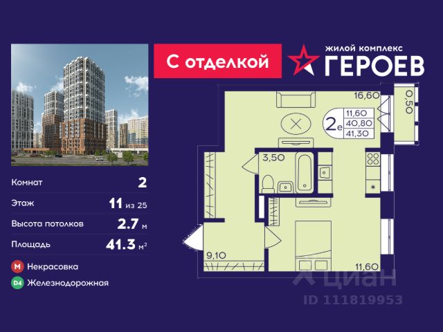 Продаётся 2-комнатная квартира 41.3 кв. м. в жилом комплексе "Героев" в Балашихе, Железнодорожный. Квартира расположена на 11 этаже 611 корпуса. Все квартиры представлены с чистовой отделкой. Вам не нужно тратить время и дополнительные финансы на ремонт или жить в шуме строительных работ - достаточно перевести свои вещи, расставить мебель и всё готово! Жилой квартал "Героев" - это уютный проект для семей с детьми. Всего 40 минут до центра Москвы. В квартале созданы все условия для досуга всех возрастов: игровые и спортивные площадки, места для отдыха и прогулок, магазины, кафе и пункты выдачи. За 15 минут можно дойти от дома до Ольгинского лесопарка - популярного места для прогулок и отдыха на свежем воздухе. Здесь приятно гулять всей семьёй, заниматься спортом или устроить пикник в выходной день. Преимущества: Квартира с готовой отделкой. Пространство полностью подготовлено для жизни: не нужно тратить время и деньги на ремонт или ждать его окончания. После получения ключей достаточно расставить мебель - и можно сразу заезжать и жить. Продуманные и светлые планировки. Просторные кухни-гостиные создают комфортное пространство для отдыха и встреч с близкими. В квартирах предусмотрены удобные гардеробные, благодаря чему легко поддерживать порядок и не перегружать комнаты шкафами. Увеличенное остекление. Большие окна наполняют квартиру естественным светом в течение всего дня, создавая ощущение простора и уюта, а также визуально расширяя пространство и делая интерьер более воздушным. Пешая доступность до станции Железнодорожная (МЦД-4) - дорога займёт не более 30 минут до центра Москвы: станции метро "Курская", "Площадь Ильича" или ТПУ Нижегородская.