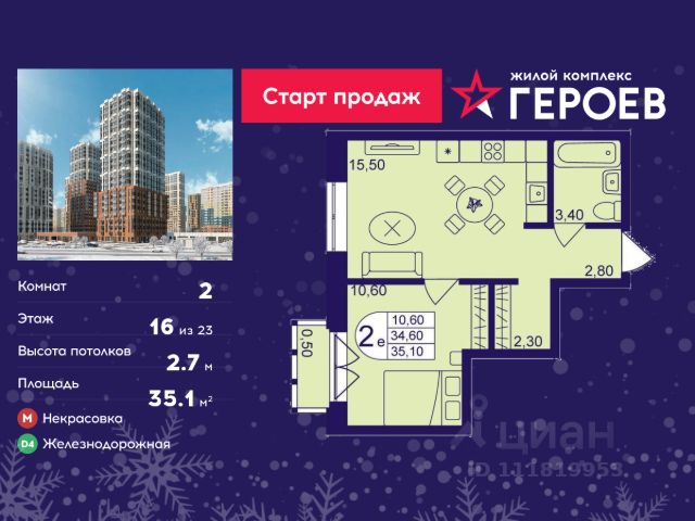 Продаётся 2-комнатная квартира в формате евро 35.10 кв. м. в жилом комплексе "Героев" в Балашихе, Железнодорожный. Квартира расположена на 16 этаже 610 корпуса. В наличии квартиры с отделкой. Всего 40 минут до центра Москвы. При покупке квартиры в сданном доме ключи выдаются сразу! Жилой квартал "Героев" - это уютный проект для семей с детьми. В квартале созданы все условия для досуга всех возрастов: игровые и спортивные площадки, места для отдыха и прогулочные зоны. За 15 минут можно дойти от дома до Ольгинского лесопарка, популярного места для отдыха на свежем воздухе. На территории жилого комплекса уже открыт детский сад на 250 мест и началось строительство еще одного - для 220 малышей, а также школы для 1320 учеников. Рядом работают магазины, кафе, супермаркеты, пункты выдачи. Преимущества: • В уютных светлых квартирах с просторными кухнями-гостиными удобно встречать гостей и проводить время наедине друг с другом. • Благодаря увеличенному остеклению в комнатах много света. • Квартиры продаются с отделкой, можно заселяться сразу после получения ключей.