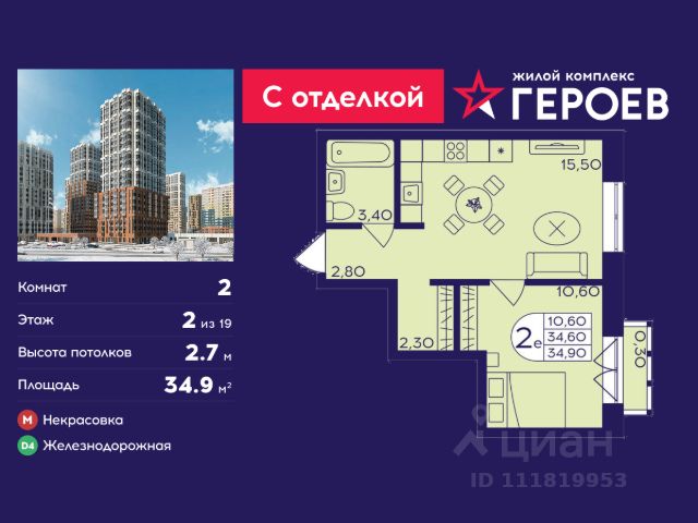 Продаётся 2-комнатная квартира 34.9 кв. м. в жилом комплексе "Героев" в Балашихе, Железнодорожный. Квартира расположена на 2 этаже 611 корпуса. Все квартиры представлены с чистовой отделкой. Вам не нужно тратить время и дополнительные финансы на ремонт или жить в шуме строительных работ - достаточно перевести свои вещи, расставить мебель и всё готово! Жилой квартал "Героев" - это уютный проект для семей с детьми. Всего 40 минут до центра Москвы. В квартале созданы все условия для досуга всех возрастов: игровые и спортивные площадки, места для отдыха и прогулок, магазины, кафе и пункты выдачи. За 15 минут можно дойти от дома до Ольгинского лесопарка - популярного места для прогулок и отдыха на свежем воздухе. Здесь приятно гулять всей семьёй, заниматься спортом или устроить пикник в выходной день. Преимущества: Квартира с готовой отделкой. Пространство полностью подготовлено для жизни: не нужно тратить время и деньги на ремонт или ждать его окончания. После получения ключей достаточно расставить мебель - и можно сразу заезжать и жить. Продуманные и светлые планировки. Просторные кухни-гостиные создают комфортное пространство для отдыха и встреч с близкими. В квартирах предусмотрены удобные гардеробные, благодаря чему легко поддерживать порядок и не перегружать комнаты шкафами. Увеличенное остекление. Большие окна наполняют квартиру естественным светом в течение всего дня, создавая ощущение простора и уюта, а также визуально расширяя пространство и делая интерьер более воздушным. Пешая доступность до станции Железнодорожная (МЦД-4) - дорога займёт не более 30 минут до центра Москвы: станции метро "Курская", "Площадь Ильича" или ТПУ Нижегородская.