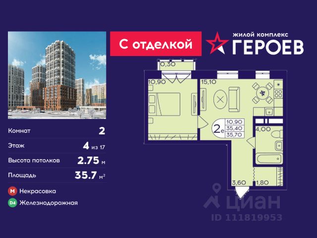 Продаётся 2-комнатная квартира 35.7 кв. м. в жилом комплексе "Героев" в Балашихе, Железнодорожный. Квартира расположена на 4 этаже 410 корпуса. Все квартиры представлены с чистовой отделкой. Вам не нужно тратить время и дополнительные финансы на ремонт или жить в шуме строительных работ - достаточно перевести свои вещи, расставить мебель и всё готово! Жилой квартал "Героев" - это уютный проект для семей с детьми. Всего 40 минут до центра Москвы. В квартале созданы все условия для досуга всех возрастов: игровые и спортивные площадки, места для отдыха и прогулок, магазины, кафе и пункты выдачи. За 15 минут можно дойти от дома до Ольгинского лесопарка - популярного места для прогулок и отдыха на свежем воздухе. Здесь приятно гулять всей семьёй, заниматься спортом или устроить пикник в выходной день. Преимущества: Квартира с готовой отделкой. Пространство полностью подготовлено для жизни: не нужно тратить время и деньги на ремонт или ждать его окончания. После получения ключей достаточно расставить мебель - и можно сразу заезжать и жить. Продуманные и светлые планировки. Просторные кухни-гостиные создают комфортное пространство для отдыха и встреч с близкими. В квартирах предусмотрены удобные гардеробные, благодаря чему легко поддерживать порядок и не перегружать комнаты шкафами. Увеличенное остекление. Большие окна наполняют квартиру естественным светом в течение всего дня, создавая ощущение простора и уюта, а также визуально расширяя пространство и делая интерьер более воздушным. Пешая доступность до станции Железнодорожная (МЦД-4) - дорога займёт не более 30 минут до центра Москвы: станции метро "Курская", "Площадь Ильича" или ТПУ Нижегородская.