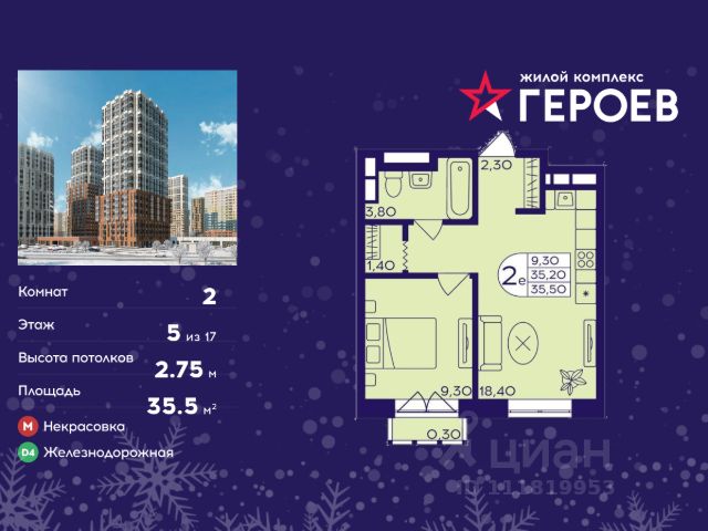 Продаётся 2-комнатная квартира в формате евро 38.40 кв. м. в жилом комплексе "Героев" в Балашихе, Железнодорожный. Квартира расположена на 15 этаже 410 корпуса. В наличии квартиры с отделкой. Всего 40 минут до центра Москвы. При покупке квартиры в сданном доме ключи выдаются сразу! Жилой квартал "Героев" - это уютный проект для семей с детьми. В квартале созданы все условия для досуга всех возрастов: игровые и спортивные площадки, места для отдыха и прогулочные зоны. За 15 минут можно дойти от дома до Ольгинского лесопарка, популярного места для отдыха на свежем воздухе. На территории жилого комплекса уже открыт детский сад на 250 мест и началось строительство еще одного - для 220 малышей, а также школы для 1320 учеников. Рядом работают магазины, кафе, супермаркеты, пункты выдачи. Преимущества: • В уютных светлых квартирах с просторными кухнями-гостиными удобно встречать гостей и проводить время наедине друг с другом. • Благодаря увеличенному остеклению в комнатах много света. • Квартиры продаются с отделкой, можно заселяться сразу после получения ключей.