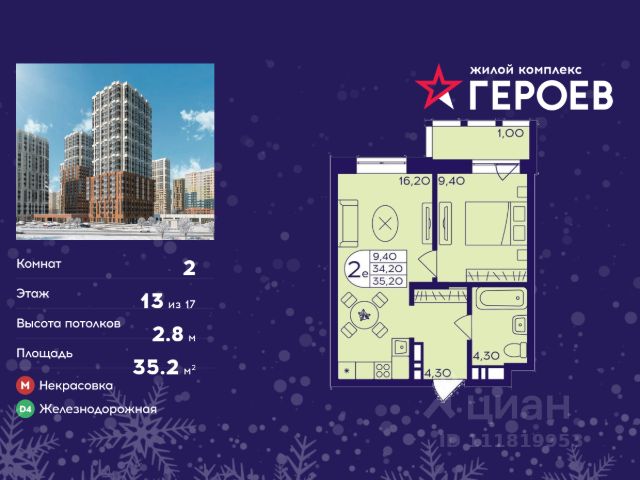 Продаётся 2-комнатная квартира в формате евро 35.20 кв. м. в жилом комплексе "Героев" в Балашихе, Железнодорожный. Квартира расположена на 13 этаже 413 корпуса. В наличии квартиры с отделкой. Всего 40 минут до центра Москвы. При покупке квартиры в сданном доме ключи выдаются сразу! Жилой квартал "Героев" - это уютный проект для семей с детьми. В квартале созданы все условия для досуга всех возрастов: игровые и спортивные площадки, места для отдыха и прогулочные зоны. За 15 минут можно дойти от дома до Ольгинского лесопарка, популярного места для отдыха на свежем воздухе. На территории жилого комплекса уже открыт детский сад на 250 мест и началось строительство еще одного - для 220 малышей, а также школы для 1320 учеников. Рядом работают магазины, кафе, супермаркеты, пункты выдачи. Преимущества: • В уютных светлых квартирах с просторными кухнями-гостиными удобно встречать гостей и проводить время наедине друг с другом. • Благодаря увеличенному остеклению в комнатах много света. • Квартиры продаются с отделкой, можно заселяться сразу после получения ключей.