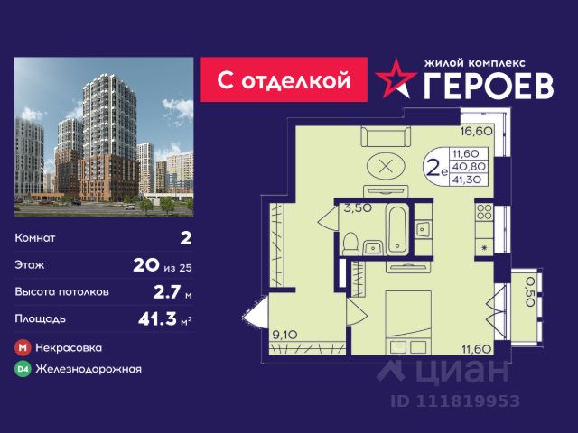 Продаётся 2-комнатная квартира 41.3 кв. м. в жилом комплексе "Героев" в Балашихе, Железнодорожный. Квартира расположена на 20 этаже 611 корпуса. Все квартиры представлены с чистовой отделкой. Вам не нужно тратить время и дополнительные финансы на ремонт или жить в шуме строительных работ - достаточно перевести свои вещи, расставить мебель и всё готово! Жилой квартал "Героев" - это уютный проект для семей с детьми. Всего 40 минут до центра Москвы. В квартале созданы все условия для досуга всех возрастов: игровые и спортивные площадки, места для отдыха и прогулок, магазины, кафе и пункты выдачи. За 15 минут можно дойти от дома до Ольгинского лесопарка - популярного места для прогулок и отдыха на свежем воздухе. Здесь приятно гулять всей семьёй, заниматься спортом или устроить пикник в выходной день. Преимущества: Квартира с готовой отделкой. Пространство полностью подготовлено для жизни: не нужно тратить время и деньги на ремонт или ждать его окончания. После получения ключей достаточно расставить мебель - и можно сразу заезжать и жить. Продуманные и светлые планировки. Просторные кухни-гостиные создают комфортное пространство для отдыха и встреч с близкими. В квартирах предусмотрены удобные гардеробные, благодаря чему легко поддерживать порядок и не перегружать комнаты шкафами. Увеличенное остекление. Большие окна наполняют квартиру естественным светом в течение всего дня, создавая ощущение простора и уюта, а также визуально расширяя пространство и делая интерьер более воздушным. Пешая доступность до станции Железнодорожная (МЦД-4) - дорога займёт не более 30 минут до центра Москвы: станции метро "Курская", "Площадь Ильича" или ТПУ Нижегородская.