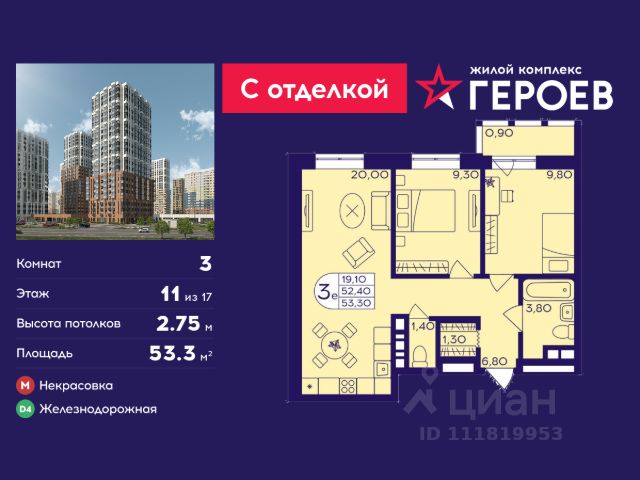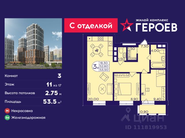 Продаётся 3-комнатная квартира 54.3 кв. м. в жилом комплексе "Героев" в Балашихе, Железнодорожный. Квартира расположена на 11 этаже 407 корпуса. Все квартиры представлены с чистовой отделкой. Вам не нужно тратить время и дополнительные финансы на ремонт или жить в шуме строительных работ - достаточно перевести свои вещи, расставить мебель и всё готово! Жилой квартал "Героев" - это уютный проект для семей с детьми. Всего 40 минут до центра Москвы. В квартале созданы все условия для досуга всех возрастов: игровые и спортивные площадки, места для отдыха и прогулок, магазины, кафе и пункты выдачи. За 15 минут можно дойти от дома до Ольгинского лесопарка - популярного места для прогулок и отдыха на свежем воздухе. Здесь приятно гулять всей семьёй, заниматься спортом или устроить пикник в выходной день. Преимущества: Квартира с готовой отделкой. Пространство полностью подготовлено для жизни: не нужно тратить время и деньги на ремонт или ждать его окончания. После получения ключей достаточно расставить мебель - и можно сразу заезжать и жить. Продуманные и светлые планировки. Просторные кухни-гостиные создают комфортное пространство для отдыха и встреч с близкими. В квартирах предусмотрены удобные гардеробные, благодаря чему легко поддерживать порядок и не перегружать комнаты шкафами. Увеличенное остекление. Большие окна наполняют квартиру естественным светом в течение всего дня, создавая ощущение простора и уюта, а также визуально расширяя пространство и делая интерьер более воздушным. Пешая доступность до станции Железнодорожная (МЦД-4) - дорога займёт не более 30 минут до центра Москвы: станции метро "Курская", "Площадь Ильича" или ТПУ Нижегородская.
