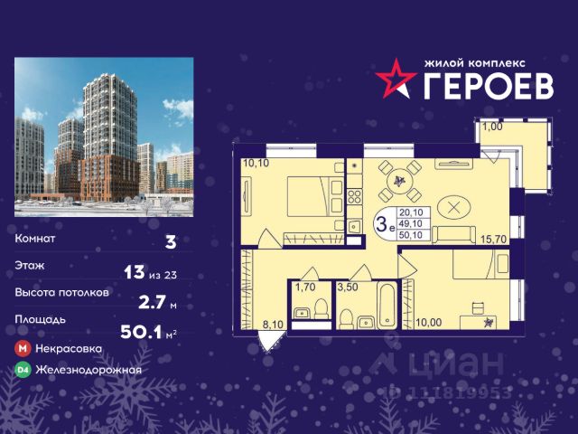 Продаётся 3-комнатная квартира в формате евро 50.10 кв. м. в жилом комплексе "Героев" в Балашихе, Железнодорожный. Квартира расположена на 13 этаже 610 корпуса. В наличии квартиры с отделкой. Всего 40 минут до центра Москвы. При покупке квартиры в сданном доме ключи выдаются сразу! Жилой квартал "Героев" - это уютный проект для семей с детьми. В квартале созданы все условия для досуга всех возрастов: игровые и спортивные площадки, места для отдыха и прогулочные зоны. За 15 минут можно дойти от дома до Ольгинского лесопарка, популярного места для отдыха на свежем воздухе. На территории жилого комплекса уже открыт детский сад на 250 мест и началось строительство еще одного - для 220 малышей, а также школы для 1320 учеников. Рядом работают магазины, кафе, супермаркеты, пункты выдачи. Преимущества: • В уютных светлых квартирах с просторными кухнями-гостиными удобно встречать гостей и проводить время наедине друг с другом. • Благодаря увеличенному остеклению в комнатах много света. • Квартиры продаются с отделкой, можно заселяться сразу после получения ключей.