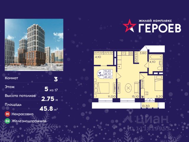 Продаётся 3-комнатная квартира в формате евро 47.50 кв. м. в жилом комплексе "Героев" в Балашихе, Железнодорожный. Квартира расположена на 3 этаже 611 корпуса. В наличии квартиры с отделкой. Всего 40 минут до центра Москвы. При покупке квартиры в сданном доме ключи выдаются сразу! Жилой квартал "Героев" - это уютный проект для семей с детьми. В квартале созданы все условия для досуга всех возрастов: игровые и спортивные площадки, места для отдыха и прогулочные зоны. За 15 минут можно дойти от дома до Ольгинского лесопарка, популярного места для отдыха на свежем воздухе. На территории жилого комплекса уже открыт детский сад на 250 мест и началось строительство еще одного - для 220 малышей, а также школы для 1320 учеников. Рядом работают магазины, кафе, супермаркеты, пункты выдачи. Преимущества: • В уютных светлых квартирах с просторными кухнями-гостиными удобно встречать гостей и проводить время наедине друг с другом. • Благодаря увеличенному остеклению в комнатах много света. • Квартиры продаются с отделкой, можно заселяться сразу после получения ключей. 3-комнатная квартира от застройщика в Балашихе.