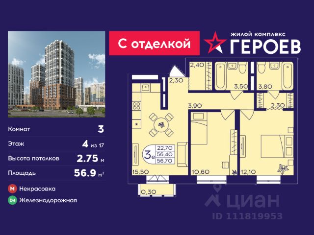 Продаётся 3-комнатная квартира 56.9 кв. м. в жилом комплексе "Героев" в Балашихе, Железнодорожный. Квартира расположена на 4 этаже 407 корпуса. Все квартиры представлены с чистовой отделкой. Вам не нужно тратить время и дополнительные финансы на ремонт или жить в шуме строительных работ - достаточно перевести свои вещи, расставить мебель и всё готово! Жилой квартал "Героев" - это уютный проект для семей с детьми. Всего 40 минут до центра Москвы. В квартале созданы все условия для досуга всех возрастов: игровые и спортивные площадки, места для отдыха и прогулок, магазины, кафе и пункты выдачи. За 15 минут можно дойти от дома до Ольгинского лесопарка - популярного места для прогулок и отдыха на свежем воздухе. Здесь приятно гулять всей семьёй, заниматься спортом или устроить пикник в выходной день. Преимущества: Квартира с готовой отделкой. Пространство полностью подготовлено для жизни: не нужно тратить время и деньги на ремонт или ждать его окончания. После получения ключей достаточно расставить мебель - и можно сразу заезжать и жить. Продуманные и светлые планировки. Просторные кухни-гостиные создают комфортное пространство для отдыха и встреч с близкими. В квартирах предусмотрены удобные гардеробные, благодаря чему легко поддерживать порядок и не перегружать комнаты шкафами. Увеличенное остекление. Большие окна наполняют квартиру естественным светом в течение всего дня, создавая ощущение простора и уюта, а также визуально расширяя пространство и делая интерьер более воздушным. Пешая доступность до станции Железнодорожная (МЦД-4) - дорога займёт не более 30 минут до центра Москвы: станции метро "Курская", "Площадь Ильича" или ТПУ Нижегородская.