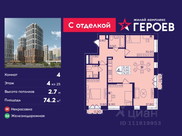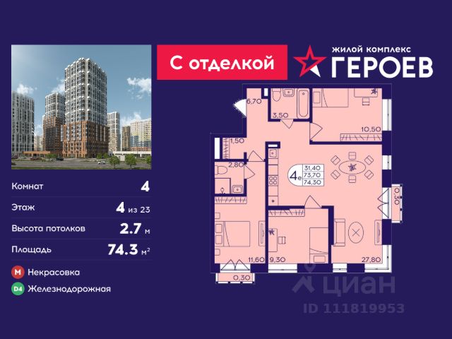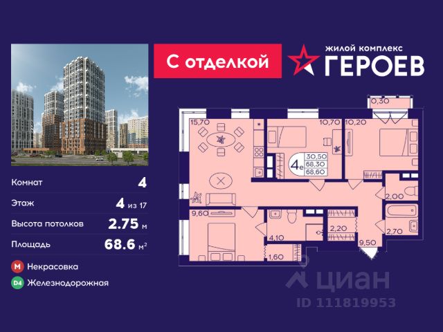 Продаётся 4-комнатная квартира 72.5 кв. м. в жилом комплексе "Героев" в Балашихе, Железнодорожный. Квартира расположена на 4 этаже 611 корпуса. Все квартиры представлены с чистовой отделкой. Вам не нужно тратить время и дополнительные финансы на ремонт или жить в шуме строительных работ - достаточно перевести свои вещи, расставить мебель и всё готово! Жилой квартал "Героев" - это уютный проект для семей с детьми. Всего 40 минут до центра Москвы. В квартале созданы все условия для досуга всех возрастов: игровые и спортивные площадки, места для отдыха и прогулок, магазины, кафе и пункты выдачи. За 15 минут можно дойти от дома до Ольгинского лесопарка - популярного места для прогулок и отдыха на свежем воздухе. Здесь приятно гулять всей семьёй, заниматься спортом или устроить пикник в выходной день. Преимущества: Квартира с готовой отделкой. Пространство полностью подготовлено для жизни: не нужно тратить время и деньги на ремонт или ждать его окончания. После получения ключей достаточно расставить мебель - и можно сразу заезжать и жить. Продуманные и светлые планировки. Просторные кухни-гостиные создают комфортное пространство для отдыха и встреч с близкими. В квартирах предусмотрены удобные гардеробные, благодаря чему легко поддерживать порядок и не перегружать комнаты шкафами. Увеличенное остекление. Большие окна наполняют квартиру естественным светом в течение всего дня, создавая ощущение простора и уюта, а также визуально расширяя пространство и делая интерьер более воздушным. Пешая доступность до станции Железнодорожная (МЦД-4) - дорога займёт не более 30 минут до центра Москвы: станции метро "Курская", "Площадь Ильича" или ТПУ Нижегородская.