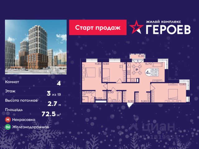 Продаётся 4-комнатная квартира в формате евро 65.20 кв. м. в жилом комплексе "Героев" в Балашихе, Железнодорожный. Квартира расположена на 3 этаже 407 корпуса. В наличии квартиры с отделкой. Всего 40 минут до центра Москвы. При покупке квартиры в сданном доме ключи выдаются сразу! Жилой квартал "Героев" - это уютный проект для семей с детьми. В квартале созданы все условия для досуга всех возрастов: игровые и спортивные площадки, места для отдыха и прогулочные зоны. За 15 минут можно дойти от дома до Ольгинского лесопарка, популярного места для отдыха на свежем воздухе. На территории жилого комплекса уже открыт детский сад на 250 мест и началось строительство еще одного - для 220 малышей, а также школы для 1320 учеников. Рядом работают магазины, кафе, супермаркеты, пункты выдачи. Преимущества: • В уютных светлых квартирах с просторными кухнями-гостиными удобно встречать гостей и проводить время наедине друг с другом. • Благодаря увеличенному остеклению в комнатах много света. • Квартиры продаются с отделкой, можно заселяться сразу после получения ключей. 4-комнатная квартира в готовой новостройке в Балашихе.