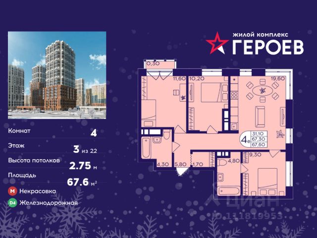 Продаётся 4-комнатная квартира в формате евро 68.60 кв. м. в жилом комплексе "Героев" в Балашихе, Железнодорожный. Квартира расположена на 2 этаже 410 корпуса. В наличии квартиры с отделкой. Всего 40 минут до центра Москвы. При покупке квартиры в сданном доме ключи выдаются сразу! Жилой квартал "Героев" - это уютный проект для семей с детьми. В квартале созданы все условия для досуга всех возрастов: игровые и спортивные площадки, места для отдыха и прогулочные зоны. За 15 минут можно дойти от дома до Ольгинского лесопарка, популярного места для отдыха на свежем воздухе. На территории жилого комплекса уже открыт детский сад на 250 мест и началось строительство еще одного - для 220 малышей, а также школы для 1320 учеников. Рядом работают магазины, кафе, супермаркеты, пункты выдачи. Преимущества: • В уютных светлых квартирах с просторными кухнями-гостиными удобно встречать гостей и проводить время наедине друг с другом. • Благодаря увеличенному остеклению в комнатах много света. • Квартиры продаются с отделкой, можно заселяться сразу после получения ключей. 4-комнатная квартира в новостройке в Балашихе.