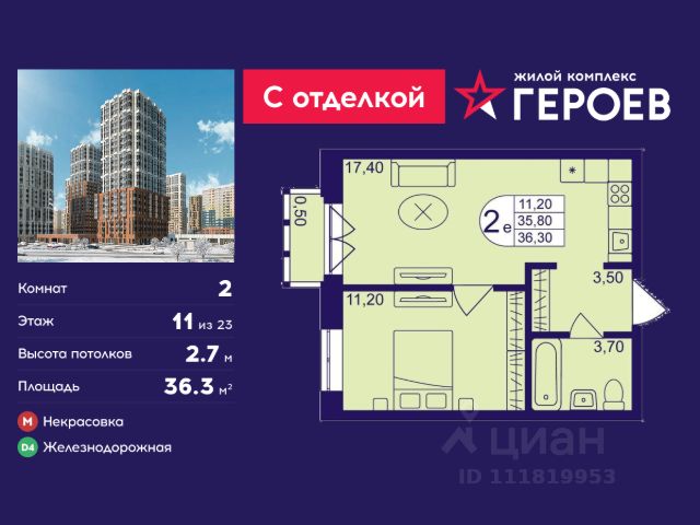 Продаётся 3-комнатная квартира 57.2 кв. м. в жилом комплексе "Героев" в Балашихе, Железнодорожный. Квартира расположена на 11 этаже 406 корпуса. Все квартиры представлены с чистовой отделкой. Вам не нужно тратить время и дополнительные финансы на ремонт или жить в шуме строительных работ - достаточно перевести свои вещи, расставить мебель и всё готово! Жилой квартал "Героев" - это уютный проект для семей с детьми. Всего 40 минут до центра Москвы. В квартале созданы все условия для досуга всех возрастов: игровые и спортивные площадки, места для отдыха и прогулок, магазины, кафе и пункты выдачи. За 15 минут можно дойти от дома до Ольгинского лесопарка - популярного места для прогулок и отдыха на свежем воздухе. Здесь приятно гулять всей семьёй, заниматься спортом или устроить пикник в выходной день. Преимущества: Квартира с готовой отделкой. Пространство полностью подготовлено для жизни: не нужно тратить время и деньги на ремонт или ждать его окончания. После получения ключей достаточно расставить мебель - и можно сразу заезжать и жить. Продуманные и светлые планировки. Просторные кухни-гостиные создают комфортное пространство для отдыха и встреч с близкими. В квартирах предусмотрены удобные гардеробные, благодаря чему легко поддерживать порядок и не перегружать комнаты шкафами. Увеличенное остекление. Большие окна наполняют квартиру естественным светом в течение всего дня, создавая ощущение простора и уюта, а также визуально расширяя пространство и делая интерьер более воздушным. Пешая доступность до станции Железнодорожная (МЦД-4) - дорога займёт не более 30 минут до центра Москвы: станции метро "Курская", "Площадь Ильича" или ТПУ Нижегородская.