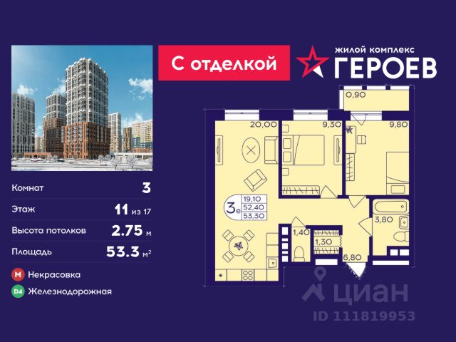 Продаётся 2-комнатная квартира 39.5 кв. м. в жилом комплексе "Героев" в Балашихе, Железнодорожный. Квартира расположена на 11 этаже 411 корпуса. Все квартиры представлены с чистовой отделкой. Вам не нужно тратить время и дополнительные финансы на ремонт или жить в шуме строительных работ - достаточно перевести свои вещи, расставить мебель и всё готово! Жилой квартал "Героев" - это уютный проект для семей с детьми. Всего 40 минут до центра Москвы. В квартале созданы все условия для досуга всех возрастов: игровые и спортивные площадки, места для отдыха и прогулок, магазины, кафе и пункты выдачи. За 15 минут можно дойти от дома до Ольгинского лесопарка - популярного места для прогулок и отдыха на свежем воздухе. Здесь приятно гулять всей семьёй, заниматься спортом или устроить пикник в выходной день. Преимущества: Квартира с готовой отделкой. Пространство полностью подготовлено для жизни: не нужно тратить время и деньги на ремонт или ждать его окончания. После получения ключей достаточно расставить мебель - и можно сразу заезжать и жить. Продуманные и светлые планировки. Просторные кухни-гостиные создают комфортное пространство для отдыха и встреч с близкими. В квартирах предусмотрены удобные гардеробные, благодаря чему легко поддерживать порядок и не перегружать комнаты шкафами. Увеличенное остекление. Большие окна наполняют квартиру естественным светом в течение всего дня, создавая ощущение простора и уюта, а также визуально расширяя пространство и делая интерьер более воздушным. Пешая доступность до станции Железнодорожная (МЦД-4) - дорога займёт не более 30 минут до центра Москвы: станции метро "Курская", "Площадь Ильича" или ТПУ Нижегородская.