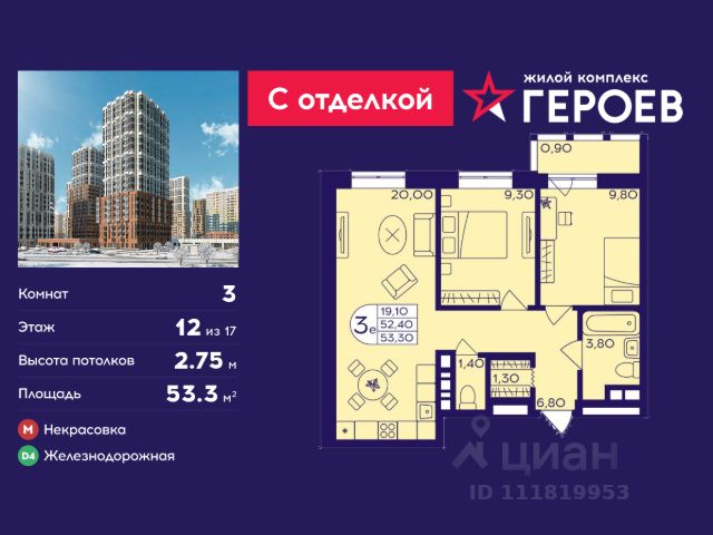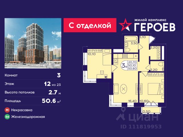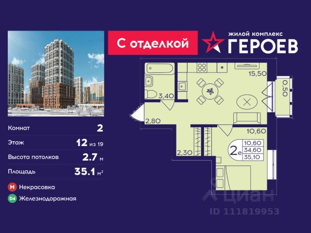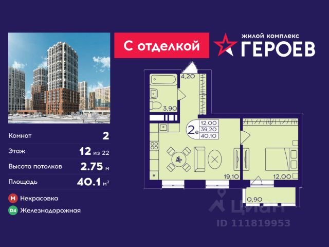 Продаётся 2-комнатная квартира 40.1 кв. м. в жилом комплексе "Героев" в Балашихе, Железнодорожный. Квартира расположена на 12 этаже 410 корпуса. Все квартиры представлены с чистовой отделкой. Вам не нужно тратить время и дополнительные финансы на ремонт или жить в шуме строительных работ - достаточно перевести свои вещи, расставить мебель и всё готово! Жилой квартал "Героев" - это уютный проект для семей с детьми. Всего 40 минут до центра Москвы. В квартале созданы все условия для досуга всех возрастов: игровые и спортивные площадки, места для отдыха и прогулок, магазины, кафе и пункты выдачи. За 15 минут можно дойти от дома до Ольгинского лесопарка - популярного места для прогулок и отдыха на свежем воздухе. Здесь приятно гулять всей семьёй, заниматься спортом или устроить пикник в выходной день. Преимущества: Квартира с готовой отделкой. Пространство полностью подготовлено для жизни: не нужно тратить время и деньги на ремонт или ждать его окончания. После получения ключей достаточно расставить мебель - и можно сразу заезжать и жить. Продуманные и светлые планировки. Просторные кухни-гостиные создают комфортное пространство для отдыха и встреч с близкими. В квартирах предусмотрены удобные гардеробные, благодаря чему легко поддерживать порядок и не перегружать комнаты шкафами. Увеличенное остекление. Большие окна наполняют квартиру естественным светом в течение всего дня, создавая ощущение простора и уюта, а также визуально расширяя пространство и делая интерьер более воздушным. Пешая доступность до станции Железнодорожная (МЦД-4) - дорога займёт не более 30 минут до центра Москвы: станции метро "Курская", "Площадь Ильича" или ТПУ Нижегородская.