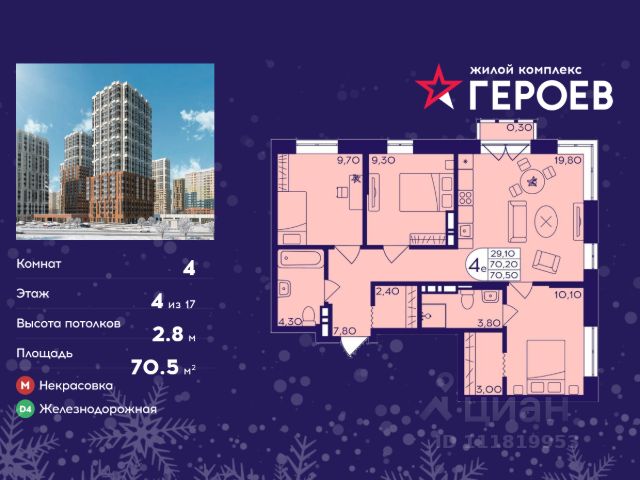 Продаётся 4-комнатная квартира в формате евро 70.50 кв. м. в жилом комплексе "Героев" в Балашихе, Железнодорожный. Квартира расположена на 4 этаже 413 корпуса. В наличии квартиры с отделкой. Всего 40 минут до центра Москвы. При покупке квартиры в сданном доме ключи выдаются сразу! Жилой квартал "Героев" - это уютный проект для семей с детьми. В квартале созданы все условия для досуга всех возрастов: игровые и спортивные площадки, места для отдыха и прогулочные зоны. За 15 минут можно дойти от дома до Ольгинского лесопарка, популярного места для отдыха на свежем воздухе. На территории жилого комплекса уже открыт детский сад на 250 мест и началось строительство еще одного - для 220 малышей, а также школы для 1320 учеников. Рядом работают магазины, кафе, супермаркеты, пункты выдачи. Преимущества: • В уютных светлых квартирах с просторными кухнями-гостиными удобно встречать гостей и проводить время наедине друг с другом. • Благодаря увеличенному остеклению в комнатах много света. • Квартиры продаются с отделкой, можно заселяться сразу после получения ключей.