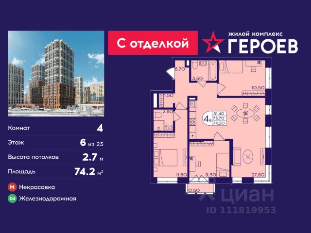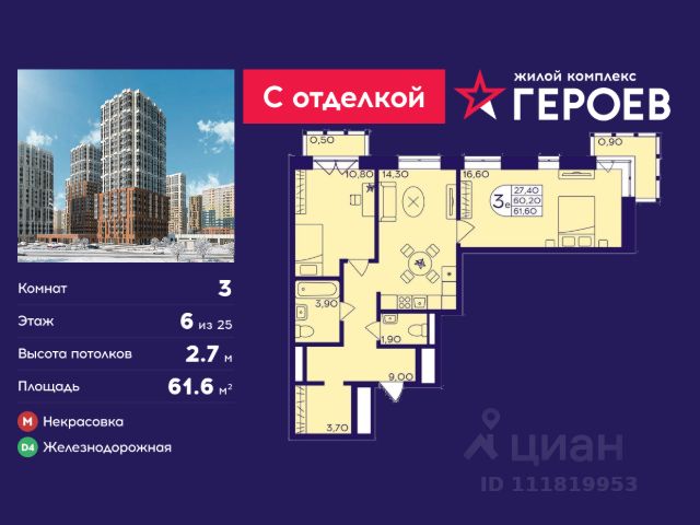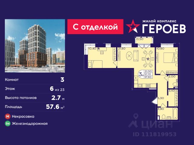 Продаётся 2-комнатная квартира 36 кв. м. в жилом комплексе "Героев" в Балашихе, Железнодорожный. Квартира расположена на 6 этаже 611 корпуса. Все квартиры представлены с чистовой отделкой. Вам не нужно тратить время и дополнительные финансы на ремонт или жить в шуме строительных работ - достаточно перевести свои вещи, расставить мебель и всё готово! Жилой квартал "Героев" - это уютный проект для семей с детьми. Всего 40 минут до центра Москвы. В квартале созданы все условия для досуга всех возрастов: игровые и спортивные площадки, места для отдыха и прогулок, магазины, кафе и пункты выдачи. За 15 минут можно дойти от дома до Ольгинского лесопарка - популярного места для прогулок и отдыха на свежем воздухе. Здесь приятно гулять всей семьёй, заниматься спортом или устроить пикник в выходной день. Преимущества: Квартира с готовой отделкой. Пространство полностью подготовлено для жизни: не нужно тратить время и деньги на ремонт или ждать его окончания. После получения ключей достаточно расставить мебель - и можно сразу заезжать и жить. Продуманные и светлые планировки. Просторные кухни-гостиные создают комфортное пространство для отдыха и встреч с близкими. В квартирах предусмотрены удобные гардеробные, благодаря чему легко поддерживать порядок и не перегружать комнаты шкафами. Увеличенное остекление. Большие окна наполняют квартиру естественным светом в течение всего дня, создавая ощущение простора и уюта, а также визуально расширяя пространство и делая интерьер более воздушным. Пешая доступность до станции Железнодорожная (МЦД-4) - дорога займёт не более 30 минут до центра Москвы: станции метро "Курская", "Площадь Ильича" или ТПУ Нижегородская.