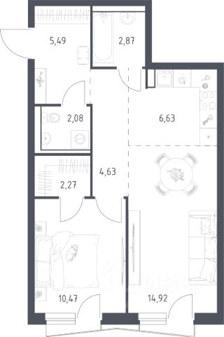 В продаже 1-комнатная квартира в корпусе 8 ЖК 'Квартал Авиаторов'. Квартира располагается на 9 этаже, общая площадь 54.9 м2.