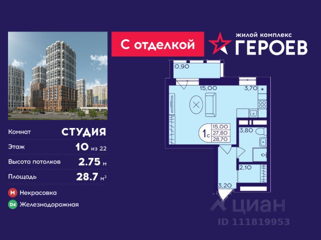 Продаётся студия 28.7 кв. м. в жилом комплексе "Героев" в Балашихе, Железнодорожный. Квартира расположена на 10 этаже 410 корпуса. Все квартиры представлены с чистовой отделкой. Вам не нужно тратить время и дополнительные финансы на ремонт или жить в шуме строительных работ - достаточно перевести свои вещи, расставить мебель и всё готово! Жилой квартал "Героев" - это уютный проект для семей с детьми. Всего 40 минут до центра Москвы. В квартале созданы все условия для досуга всех возрастов: игровые и спортивные площадки, места для отдыха и прогулок, магазины, кафе и пункты выдачи. За 15 минут можно дойти от дома до Ольгинского лесопарка - популярного места для прогулок и отдыха на свежем воздухе. Здесь приятно гулять всей семьёй, заниматься спортом или устроить пикник в выходной день. Преимущества: Квартира с готовой отделкой. Пространство полностью подготовлено для жизни: не нужно тратить время и деньги на ремонт или ждать его окончания. После получения ключей достаточно расставить мебель - и можно сразу заезжать и жить. Продуманные и светлые планировки. Просторные кухни-гостиные создают комфортное пространство для отдыха и встреч с близкими. В квартирах предусмотрены удобные гардеробные, благодаря чему легко поддерживать порядок и не перегружать комнаты шкафами. Увеличенное остекление. Большие окна наполняют квартиру естественным светом в течение всего дня, создавая ощущение простора и уюта, а также визуально расширяя пространство и делая интерьер более воздушным. Пешая доступность до станции Железнодорожная (МЦД-4) - дорога займёт не более 30 минут до центра Москвы: станции метро "Курская", "Площадь Ильича" или ТПУ Нижегородская.