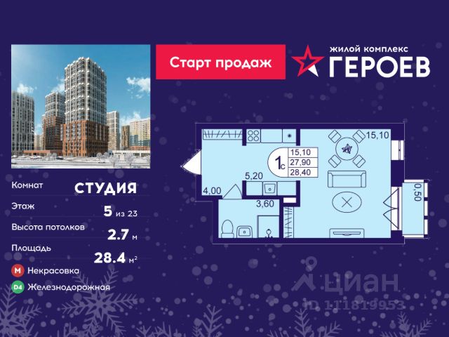 Продаётся студия 28.40 кв. м. в жилом комплексе "Героев" в Балашихе, Железнодорожный. Квартира расположена на 5 этаже 610 корпуса. В наличии квартиры с отделкой. Всего 40 минут до центра Москвы. При покупке квартиры в сданном доме ключи выдаются сразу! Жилой квартал "Героев" - это уютный проект для семей с детьми. В квартале созданы все условия для досуга всех возрастов: игровые и спортивные площадки, места для отдыха и прогулочные зоны. За 15 минут можно дойти от дома до Ольгинского лесопарка, популярного места для отдыха на свежем воздухе. На территории жилого комплекса уже открыт детский сад на 250 мест и началось строительство еще одного - для 220 малышей, а также школы для 1320 учеников. Рядом работают магазины, кафе, супермаркеты, пункты выдачи. Преимущества: • В уютных светлых квартирах с просторными кухнями-гостиными удобно встречать гостей и проводить время наедине друг с другом. • Благодаря увеличенному остеклению в комнатах много света. • Квартиры продаются с отделкой, можно заселяться сразу после получения ключей.