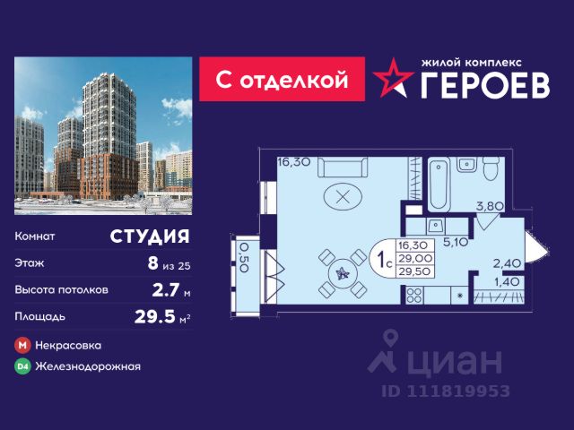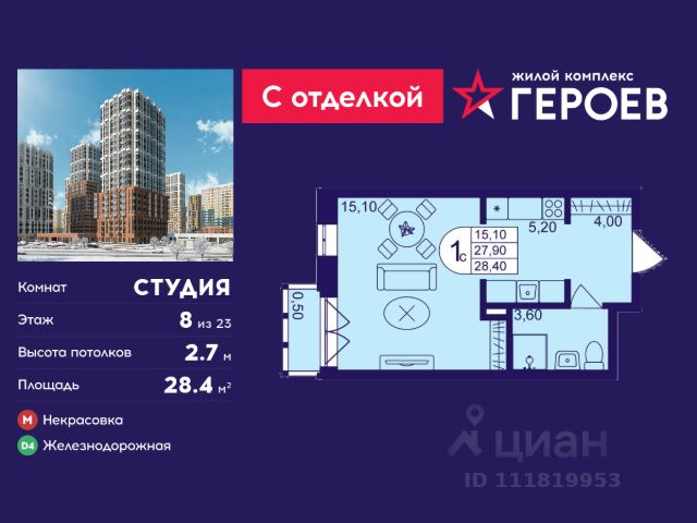 Продаётся студия 28.4 кв. м. в жилом комплексе "Героев" в Балашихе, Железнодорожный. Квартира расположена на 8 этаже 611 корпуса. Все квартиры представлены с чистовой отделкой. Вам не нужно тратить время и дополнительные финансы на ремонт или жить в шуме строительных работ - достаточно перевести свои вещи, расставить мебель и всё готово! Жилой квартал "Героев" - это уютный проект для семей с детьми. Всего 40 минут до центра Москвы. В квартале созданы все условия для досуга всех возрастов: игровые и спортивные площадки, места для отдыха и прогулок, магазины, кафе и пункты выдачи. За 15 минут можно дойти от дома до Ольгинского лесопарка - популярного места для прогулок и отдыха на свежем воздухе. Здесь приятно гулять всей семьёй, заниматься спортом или устроить пикник в выходной день. Преимущества: Квартира с готовой отделкой. Пространство полностью подготовлено для жизни: не нужно тратить время и деньги на ремонт или ждать его окончания. После получения ключей достаточно расставить мебель - и можно сразу заезжать и жить. Продуманные и светлые планировки. Просторные кухни-гостиные создают комфортное пространство для отдыха и встреч с близкими. В квартирах предусмотрены удобные гардеробные, благодаря чему легко поддерживать порядок и не перегружать комнаты шкафами. Увеличенное остекление. Большие окна наполняют квартиру естественным светом в течение всего дня, создавая ощущение простора и уюта, а также визуально расширяя пространство и делая интерьер более воздушным. Пешая доступность до станции Железнодорожная (МЦД-4) - дорога займёт не более 30 минут до центра Москвы: станции метро "Курская", "Площадь Ильича" или ТПУ Нижегородская.