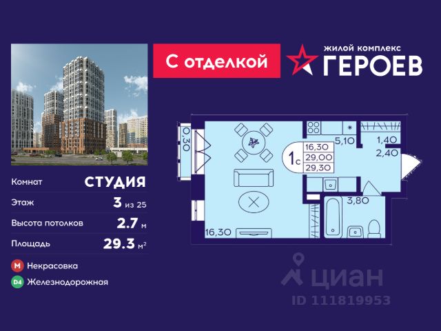 Продаётся студия 26.7 кв. м. в жилом комплексе "Героев" в Балашихе, Железнодорожный. Квартира расположена на 4 этаже 410 корпуса. Все квартиры представлены с чистовой отделкой. Вам не нужно тратить время и дополнительные финансы на ремонт или жить в шуме строительных работ - достаточно перевести свои вещи, расставить мебель и всё готово! Жилой квартал "Героев" - это уютный проект для семей с детьми. Всего 40 минут до центра Москвы. В квартале созданы все условия для досуга всех возрастов: игровые и спортивные площадки, места для отдыха и прогулок, магазины, кафе и пункты выдачи. За 15 минут можно дойти от дома до Ольгинского лесопарка - популярного места для прогулок и отдыха на свежем воздухе. Здесь приятно гулять всей семьёй, заниматься спортом или устроить пикник в выходной день. Преимущества: Квартира с готовой отделкой. Пространство полностью подготовлено для жизни: не нужно тратить время и деньги на ремонт или ждать его окончания. После получения ключей достаточно расставить мебель - и можно сразу заезжать и жить. Продуманные и светлые планировки. Просторные кухни-гостиные создают комфортное пространство для отдыха и встреч с близкими. В квартирах предусмотрены удобные гардеробные, благодаря чему легко поддерживать порядок и не перегружать комнаты шкафами. Увеличенное остекление. Большие окна наполняют квартиру естественным светом в течение всего дня, создавая ощущение простора и уюта, а также визуально расширяя пространство и делая интерьер более воздушным. Пешая доступность до станции Железнодорожная (МЦД-4) - дорога займёт не более 30 минут до центра Москвы: станции метро "Курская", "Площадь Ильича" или ТПУ Нижегородская.
