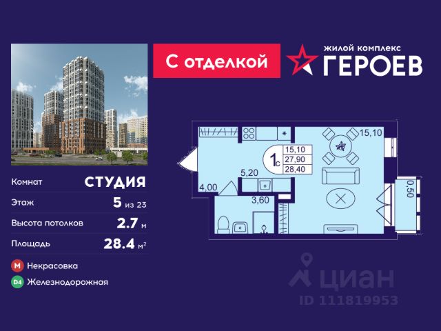Продаётся студия 28.4 кв. м. в жилом комплексе "Героев" в Балашихе, Железнодорожный. Квартира расположена на 5 этаже 610 корпуса. Все квартиры представлены с чистовой отделкой. Вам не нужно тратить время и дополнительные финансы на ремонт или жить в шуме строительных работ - достаточно перевести свои вещи, расставить мебель и всё готово! Жилой квартал "Героев" - это уютный проект для семей с детьми. Всего 40 минут до центра Москвы. В квартале созданы все условия для досуга всех возрастов: игровые и спортивные площадки, места для отдыха и прогулок, магазины, кафе и пункты выдачи. За 15 минут можно дойти от дома до Ольгинского лесопарка - популярного места для прогулок и отдыха на свежем воздухе. Здесь приятно гулять всей семьёй, заниматься спортом или устроить пикник в выходной день. Преимущества: Квартира с готовой отделкой. Пространство полностью подготовлено для жизни: не нужно тратить время и деньги на ремонт или ждать его окончания. После получения ключей достаточно расставить мебель - и можно сразу заезжать и жить. Продуманные и светлые планировки. Просторные кухни-гостиные создают комфортное пространство для отдыха и встреч с близкими. В квартирах предусмотрены удобные гардеробные, благодаря чему легко поддерживать порядок и не перегружать комнаты шкафами. Увеличенное остекление. Большие окна наполняют квартиру естественным светом в течение всего дня, создавая ощущение простора и уюта, а также визуально расширяя пространство и делая интерьер более воздушным. Пешая доступность до станции Железнодорожная (МЦД-4) - дорога займёт не более 30 минут до центра Москвы: станции метро "Курская", "Площадь Ильича" или ТПУ Нижегородская.
