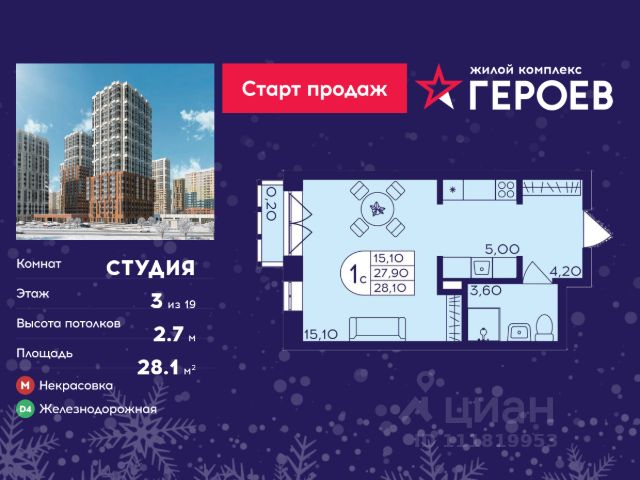 Продаётся студия 28.10 кв. м. в жилом комплексе "Героев" в Балашихе, Железнодорожный. Квартира расположена на 3 этаже 611 корпуса. В наличии квартиры с отделкой. Всего 40 минут до центра Москвы. При покупке квартиры в сданном доме ключи выдаются сразу! Жилой квартал "Героев" - это уютный проект для семей с детьми. В квартале созданы все условия для досуга всех возрастов: игровые и спортивные площадки, места для отдыха и прогулочные зоны. За 15 минут можно дойти от дома до Ольгинского лесопарка, популярного места для отдыха на свежем воздухе. На территории жилого комплекса уже открыт детский сад на 250 мест и началось строительство еще одного - для 220 малышей, а также школы для 1320 учеников. Рядом работают магазины, кафе, супермаркеты, пункты выдачи. Преимущества: • В уютных светлых квартирах с просторными кухнями-гостиными удобно встречать гостей и проводить время наедине друг с другом. • Благодаря увеличенному остеклению в комнатах много света. • Квартиры продаются с отделкой, можно заселяться сразу после получения ключей. Продам квартиру-студию от застройщика В Балашихе.