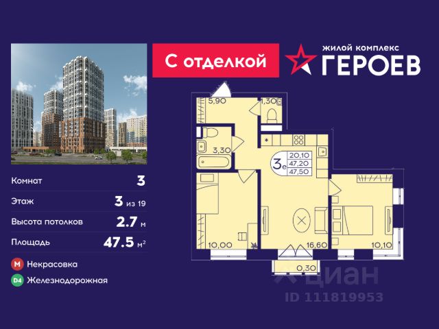 Продаётся 2-комнатная квартира 35 кв. м. в жилом комплексе "Героев" в Балашихе, Железнодорожный. Квартира расположена на 3 этаже 611 корпуса. Все квартиры представлены с чистовой отделкой. Вам не нужно тратить время и дополнительные финансы на ремонт или жить в шуме строительных работ - достаточно перевести свои вещи, расставить мебель и всё готово! Жилой квартал "Героев" - это уютный проект для семей с детьми. Всего 40 минут до центра Москвы. В квартале созданы все условия для досуга всех возрастов: игровые и спортивные площадки, места для отдыха и прогулок, магазины, кафе и пункты выдачи. За 15 минут можно дойти от дома до Ольгинского лесопарка - популярного места для прогулок и отдыха на свежем воздухе. Здесь приятно гулять всей семьёй, заниматься спортом или устроить пикник в выходной день. Преимущества: Квартира с готовой отделкой. Пространство полностью подготовлено для жизни: не нужно тратить время и деньги на ремонт или ждать его окончания. После получения ключей достаточно расставить мебель - и можно сразу заезжать и жить. Продуманные и светлые планировки. Просторные кухни-гостиные создают комфортное пространство для отдыха и встреч с близкими. В квартирах предусмотрены удобные гардеробные, благодаря чему легко поддерживать порядок и не перегружать комнаты шкафами. Увеличенное остекление. Большие окна наполняют квартиру естественным светом в течение всего дня, создавая ощущение простора и уюта, а также визуально расширяя пространство и делая интерьер более воздушным. Пешая доступность до станции Железнодорожная (МЦД-4) - дорога займёт не более 30 минут до центра Москвы: станции метро "Курская", "Площадь Ильича" или ТПУ Нижегородская.