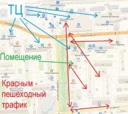 Помещение выгодно расположено в самом центре сложившейся развитой торговой зоны. Фактором притяжения пешеходного трафика являются множество торговых центров, большое количество магазинов, аптек, заведений общественного питания и т.д., расположенных в непосредственной близости от станции и от помещения. Среди них супермаркеты Дикси, Перекресток, Пятерочка, Магнит, а также Сбербанк, ВТБ, Пронто и др.