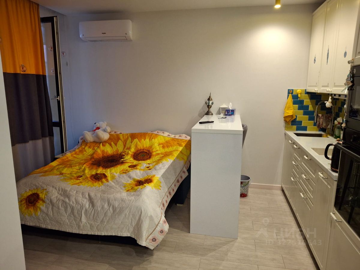 Квартира с евроремонтом, обставлена современной мебелью и оснащена всей необходимой техникой: кондиционер, холодильник, посудомоечная машина, телевизор, стиральная машина. В кухонной зоне также есть вся необходимая мебель. Ванная комната оборудована ванной. Планировка студии позволяет эффективно использовать пространство.