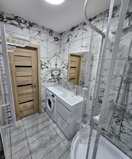 Пол: кварцвинил и плитка, затирка эпоксидная, по углам силиконовый герметик.