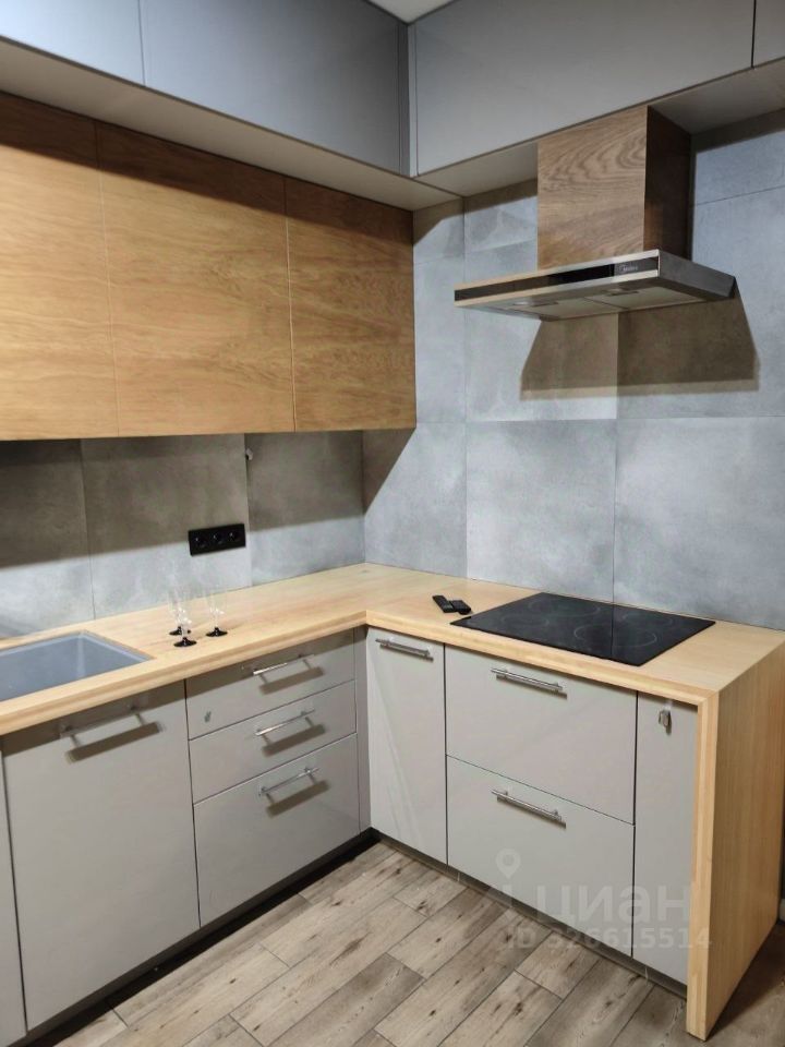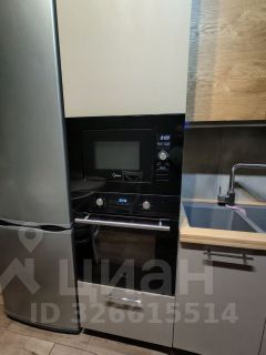 Кухня оборудована всей необходимой техникой: холодильник, варочная панель, духовой шкаф и вытяжка. Из мебели — вместительные шкафы. В гостиной установлены удобный диван.