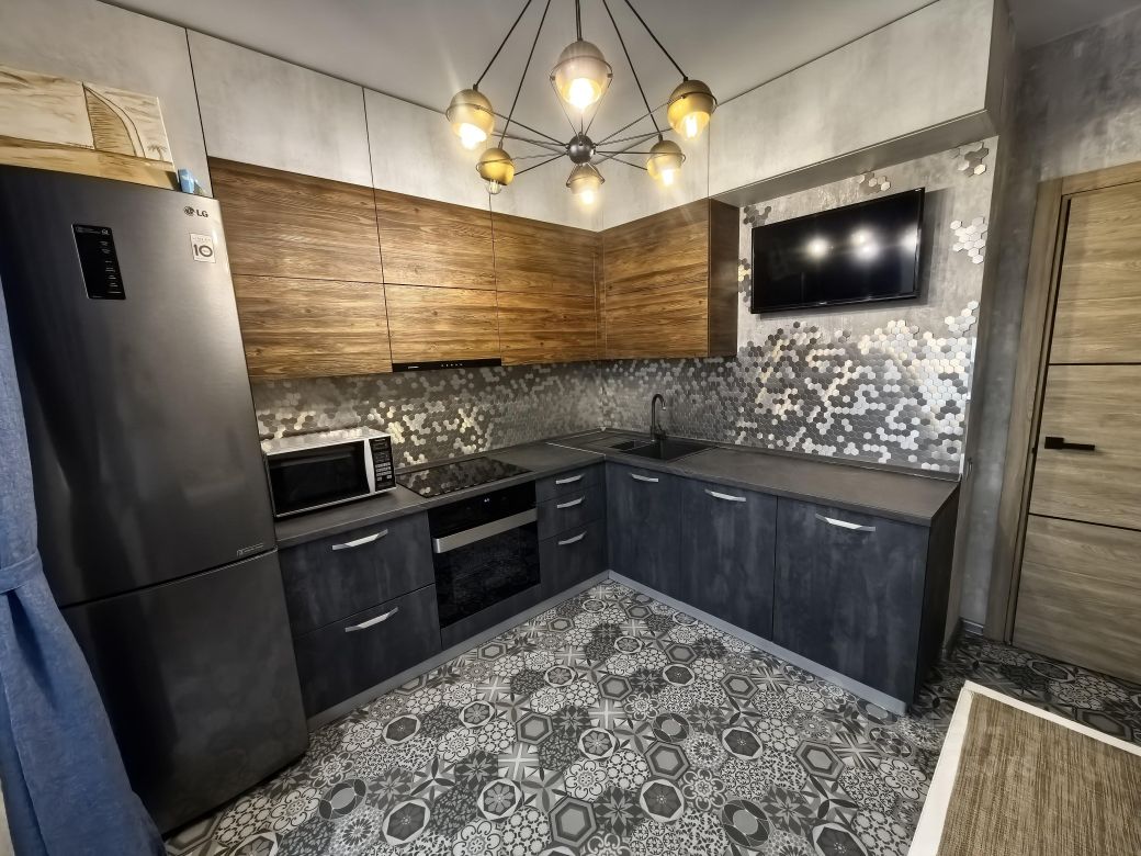 В квартире есть всё необходимое для комфортной жизни. Просторная кухня площадью 9 кв. м оснащена всей необходимой мебелью и техникой, включая холодильник и стиральную машину. В комнате также есть мебель и телевизор. Ванная комната оборудована душевой кабиной.