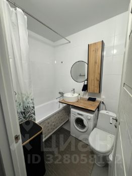 Полностью новый: ванна, подвесная раковина на деревянной столешнице, круглое зеркало, навесной шкаф. Встроенная стиральная машина — всё компактно и функционально.