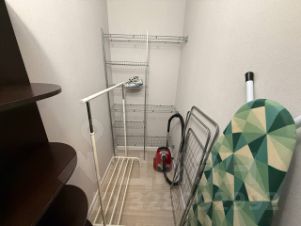 Также есть рейл для одежды, пылесос, утюг, гладильная доска, сушилка для белья и фен.