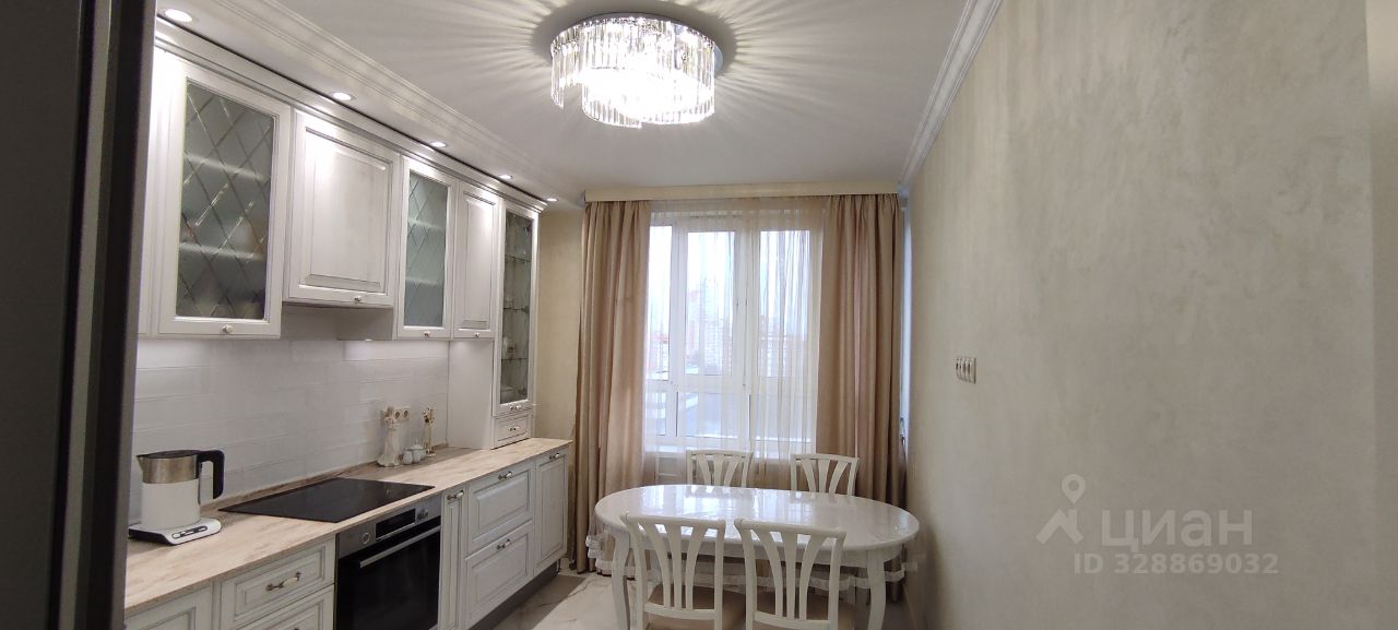 Просторная кухня с кухонным гарнитуром и большим обеденным столом, отделана в теплых тонах, на стенах венецианская штукатурка, двери в тон стен, теплого цвета слоновой кости.