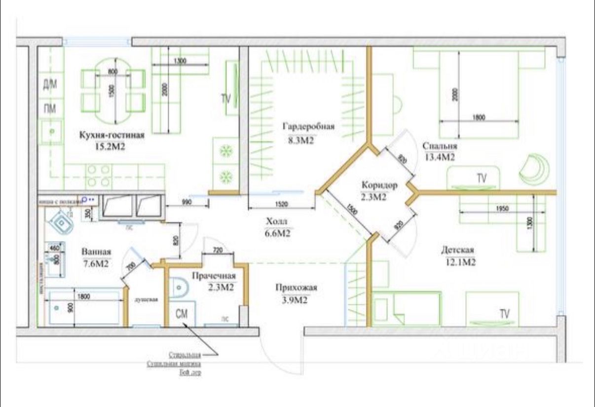 - большая кухня столовая гостиная 15, 2 кв, - две изолированные спальни 13,4 и 12,1 кв, гардеробная 8,3 кв, большой санузел 7,6 кв, постирочная 2,3 кв. Планировка прилагается.