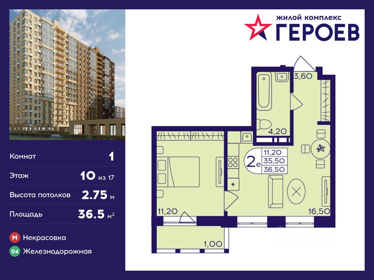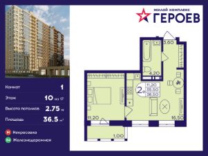 Продаётся 1-комнатная квартира 36.50 кв. м. в жилом комплексе "Героев" в Балашихе, Железнодорожный. Квартира расположена на 10 этаже 412 корпуса.