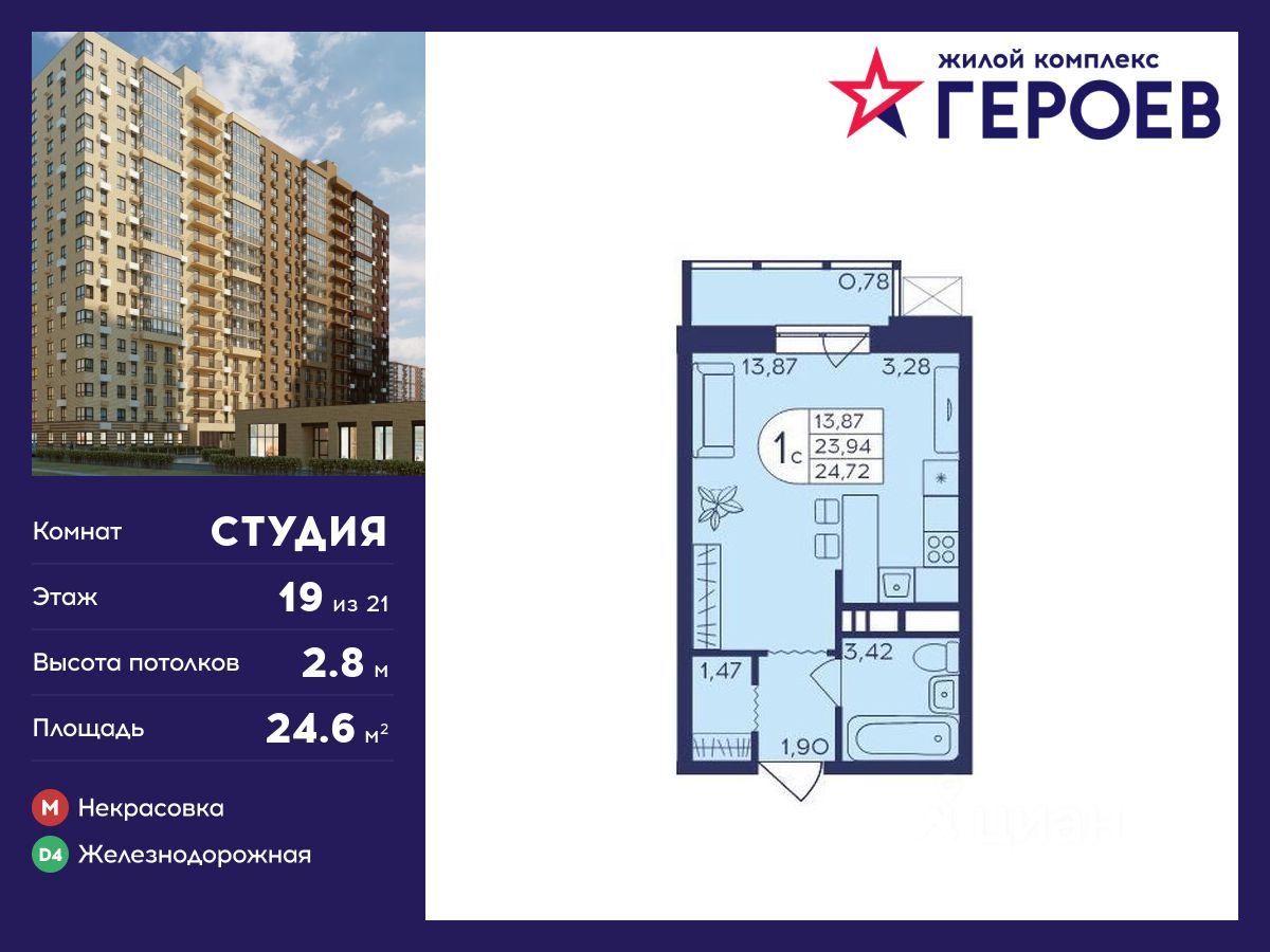 Продаётся студия 24.60 кв. м. в жилом комплексе "Героев" в Балашихе, Железнодорожный. Квартира расположена на 19 этаже 403 корпуса.