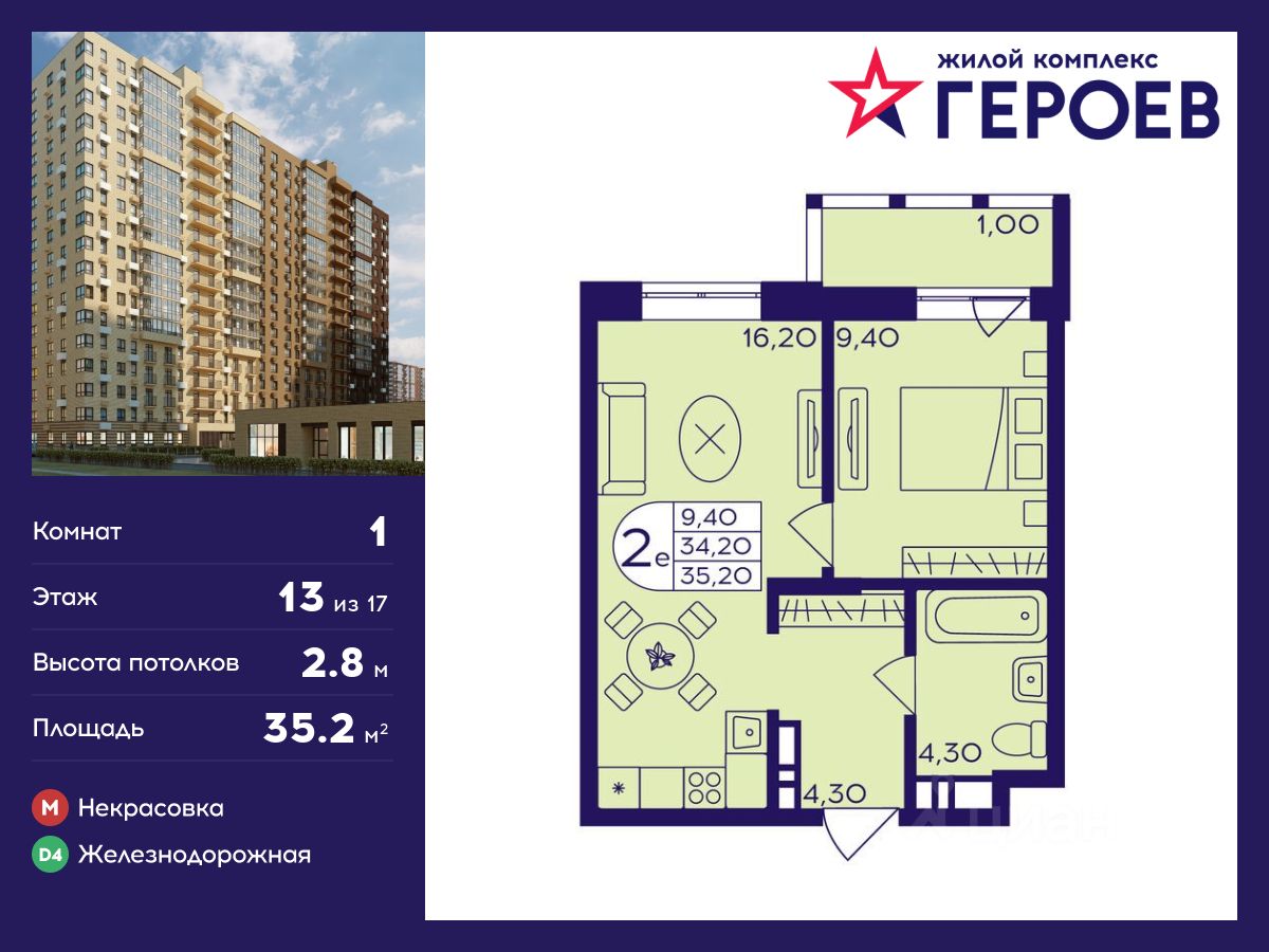 Продаётся 1-комнатная квартира 35.20 кв. м. в жилом комплексе "Героев" в Балашихе, Железнодорожный. Квартира расположена на 13 этаже 413 корпуса.