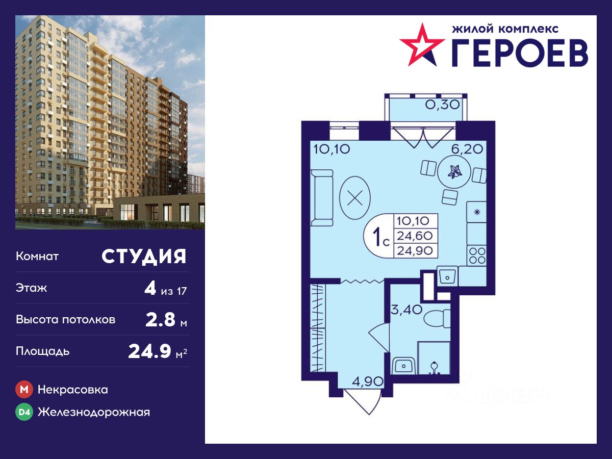 Продаётся студия 24.90 кв. м. в жилом комплексе "Героев" в Балашихе, Железнодорожный. Квартира расположена на 4 этаже 413 корпуса.