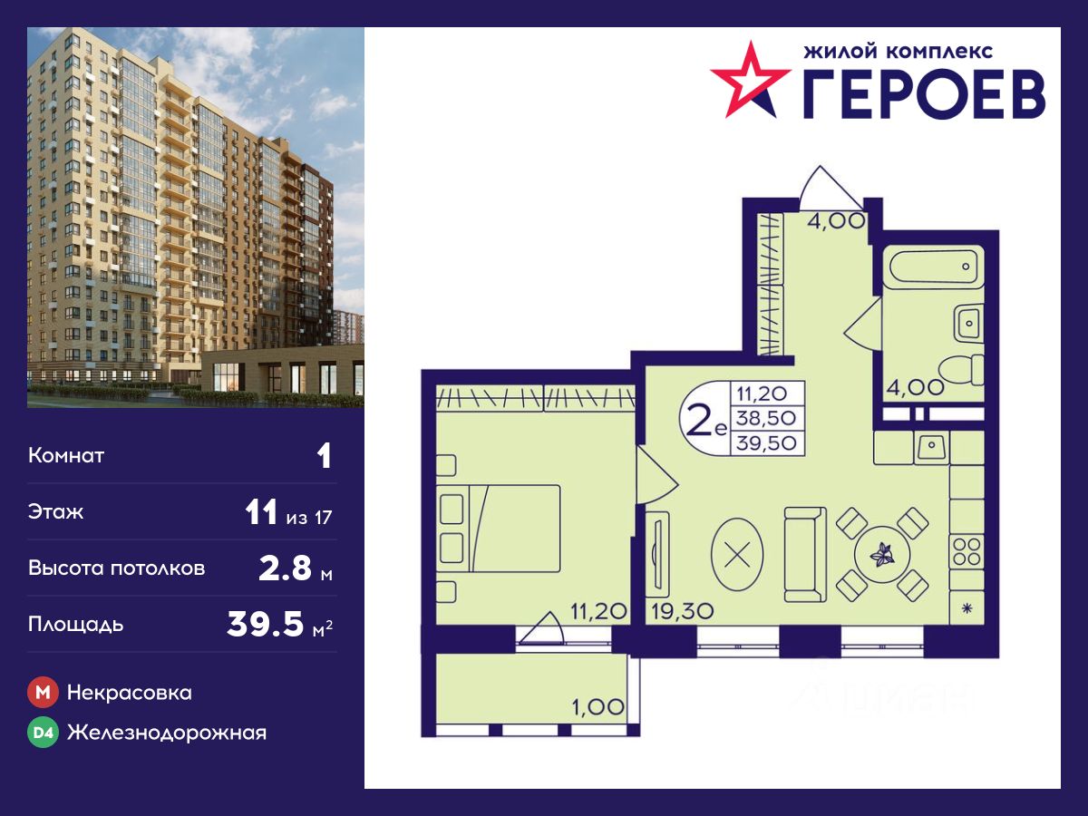 Продаётся 1-комнатная квартира 39.50 кв. м. в жилом комплексе "Героев" в Балашихе, Железнодорожный. Квартира расположена на 11 этаже 413 корпуса.