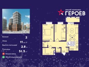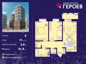 Продаётся 2-комнатная квартира 51.30 кв. м. в жилом комплексе "Героев" в Балашихе, Железнодорожный. Квартира расположена на 11 этаже 413 корпуса.
