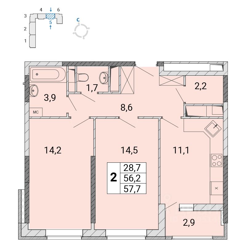Продаётся 2-комнатная квартира в сданном доме (улица Поликахина, 2 (Корпус 305)), срок сдачи: III-кв. 2022, общей площадью 57.8 кв.м., на 12 этаже. Расположение в самом центре города обеспечивает доступ к богатой торговой, развлекательной, социальной инфраструктуре Железнодорожного. При этом собственная инфраструктура микрорайона сделает "Центр-2" не только географическим, но и общественным центром жизни города Железнодорожный. Территория микрорайона делится на две части широким благоустроенным бульваром. На первых этажах домов расположатся магазины, кафе, рестораны, точки сервисного обслуживания, салоны красоты.