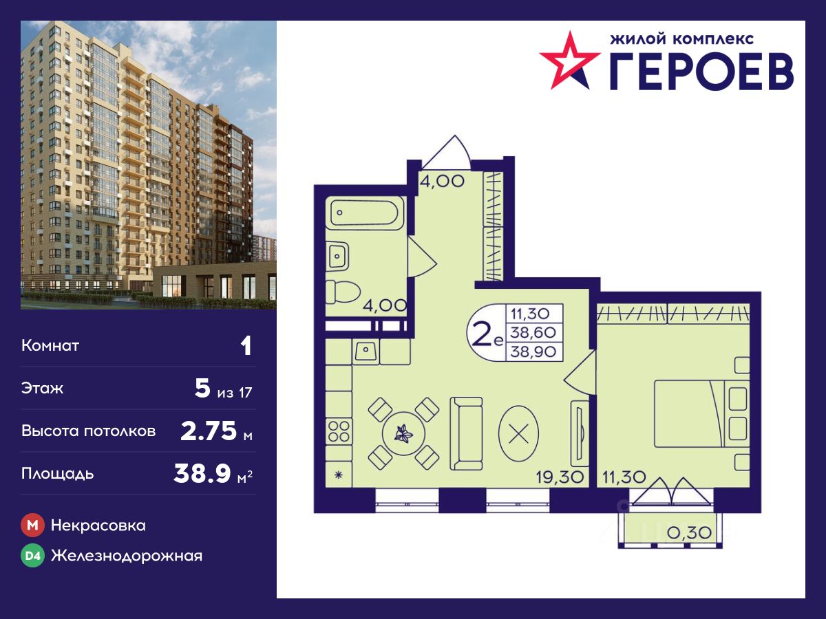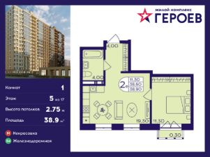 Продаётся 1-комнатная квартира 38.90 кв. м. в жилом комплексе "Героев" в Балашихе, Железнодорожный. Квартира расположена на 5 этаже 411 корпуса.