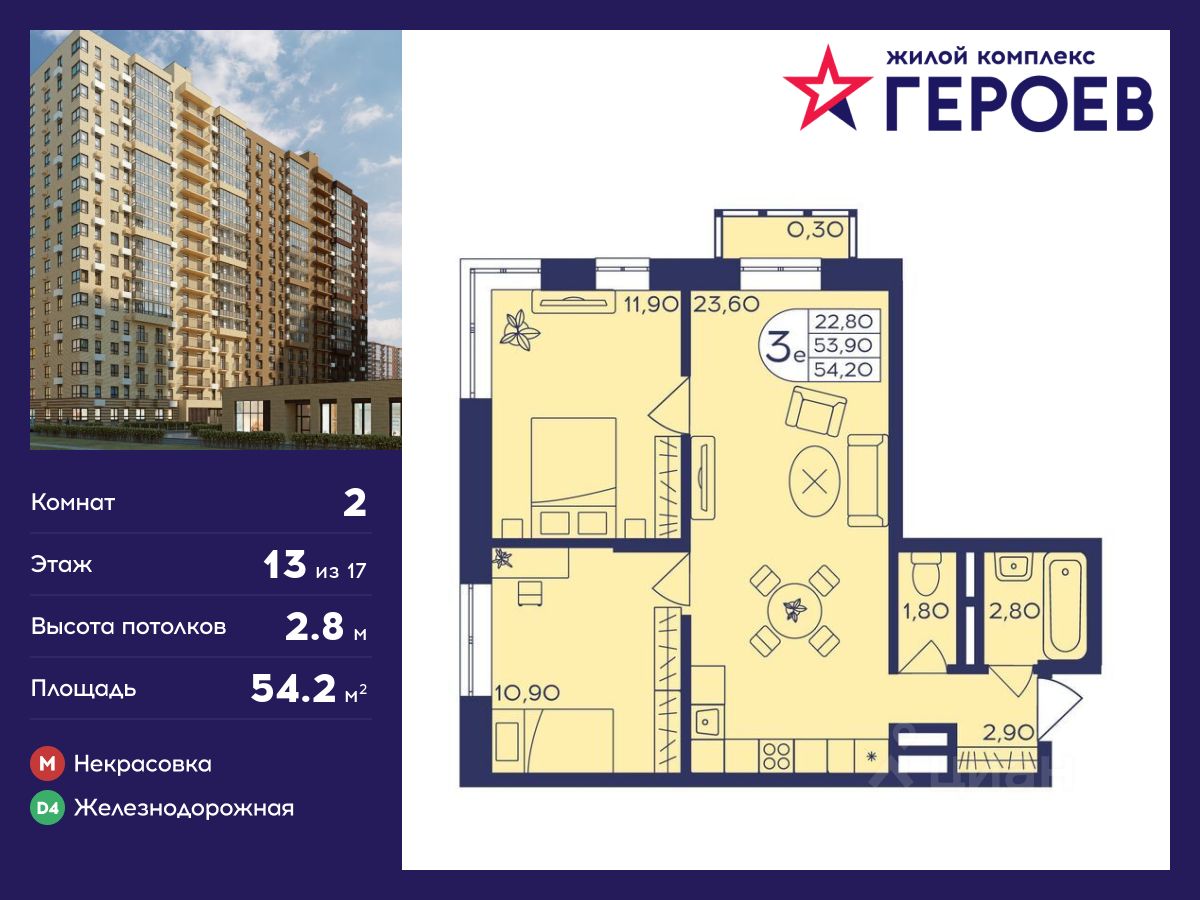 Продаётся 2-комнатная квартира 54.20 кв. м. в жилом комплексе "Героев" в Балашихе, Железнодорожный. Квартира расположена на 13 этаже 406 корпуса.