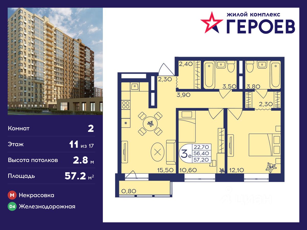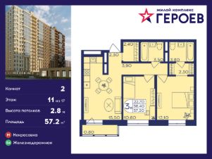 Продаётся 2-комнатная квартира 57.20 кв. м. в жилом комплексе "Героев" в Балашихе, Железнодорожный. Квартира расположена на 11 этаже 406 корпуса.