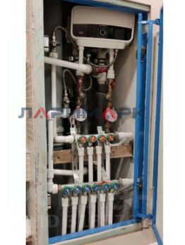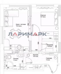 Кухня-гостиная (13.2м²) с кондиционером, которого хватит на всю квартиру. Комната (9.7м²) с разноуровневым освещением. В кладовой (1.9м²) встроенная система вентиляции. Совместный санузел (4м²) оборудован водонагревателем, теплым полом и гигиеническим душем.